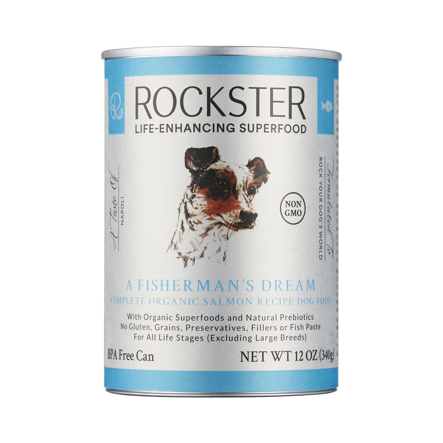 Certified organic complete wet food for all dog breeds, using carefully selected human grade and non-GMO ingredients of the highest quality that are fit for royalty. This scientifically formulated single protein recipe uses natural nutrition to create a nutritionally balanced superfood for very special dogs. Gently steamed from raw in the can to preserve vital nutrients and vitamins, this unique recipe includes 83.5% organic salmon, 2% calamari and 2% mussels. Essential additional nutrients and antioxidants are provided through a carefully formulated mix of organic and nutritionally dense ingredients, including zucchini, quinoa, quince and carrots, creating a balanced and delicious superfood with a compelling taste for discerning dogs. Organic salmon is a great natural source of Omega 3 fatty acids, providing this recipe with its optimal Omega 6:3 ratio. EPA and DHA aid in cardiovascular, musculoskeletal, metabolic and neurological support, while assisting cellular regulation. As with all of our recipes, inulin from fermented Jerusalem artichoke concentrate is added as a natural prebiotic. Created originally for a magical street dog rescued from Napoli, Rockster is the epitome of life-enhancing nutrition that will rock your dog’s world too.