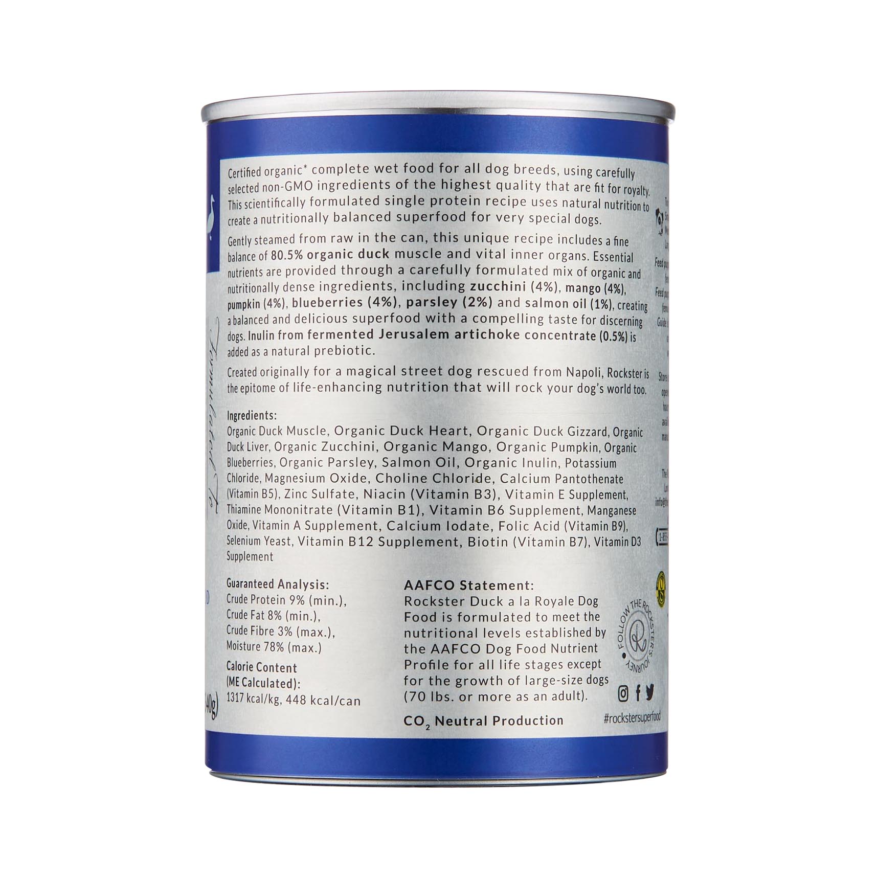 Certified organic complete wet food for all dog breeds, using carefully selected human grade and non-GMO ingredients of the highest quality that are fit for royalty. This scientifically formulated single protein recipe uses natural nutrition to create a nutritionally balanced superfood for very special dogs. Gently steamed from raw in the can to preserve vital nutrients and vitamins, this unique recipe includes a fine balance of 80.5% organic duck muscle and vital inner organs. Essential nutrients and antioxidants are provided through a carefully formulated mix of organic and nutritionally dense ingredients, including zucchini, mango, pumpkin, and parsley, creating a balanced and delicious superfood with a compelling taste for discerning dogs. Blueberries are an excellent source of antioxidants and salmon oil is a great natural source of Omega 3 fatty acids, providing this recipe with its optimal Omega 6:3 ratio as well as skin & coat, cellular, metabolic and immune support. As with all of our recipes, inulin from fermented Jerusalem artichoke concentrate is added as a natural prebiotic. Created originally for a magical street dog rescued from Napoli, Rockster is the epitome of life-enhancing nutrition that will rock your dog’s world too.